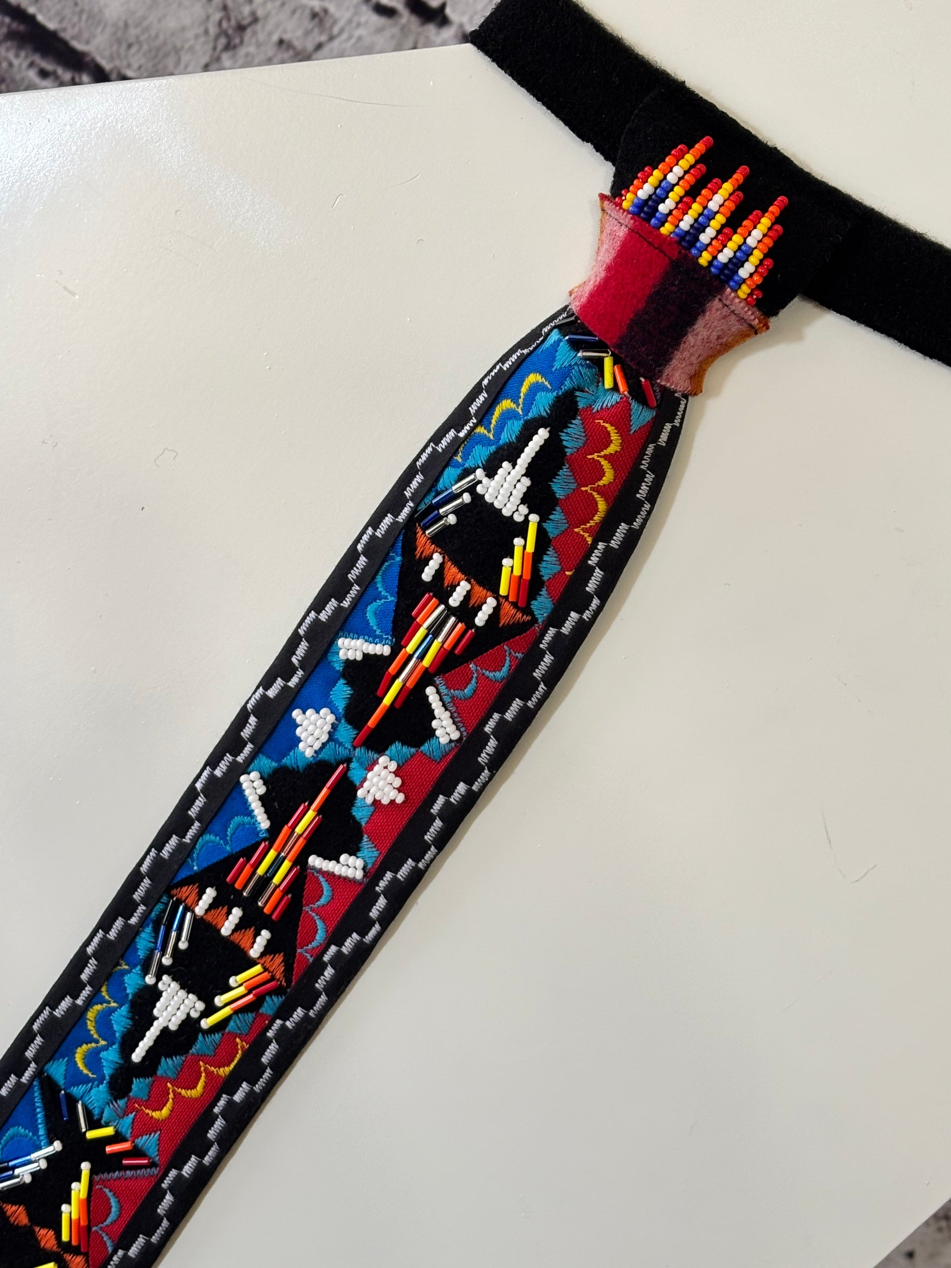 A split Red and Blue appliqué necktie made with black wool broadcloth. Cotton designs in red and blue are appliquéd with coordinating thread colors. Custom beadwork using bugle beads and seed beads. Edged in black bias. Measures around 22” long and has an adjustable neckline.
