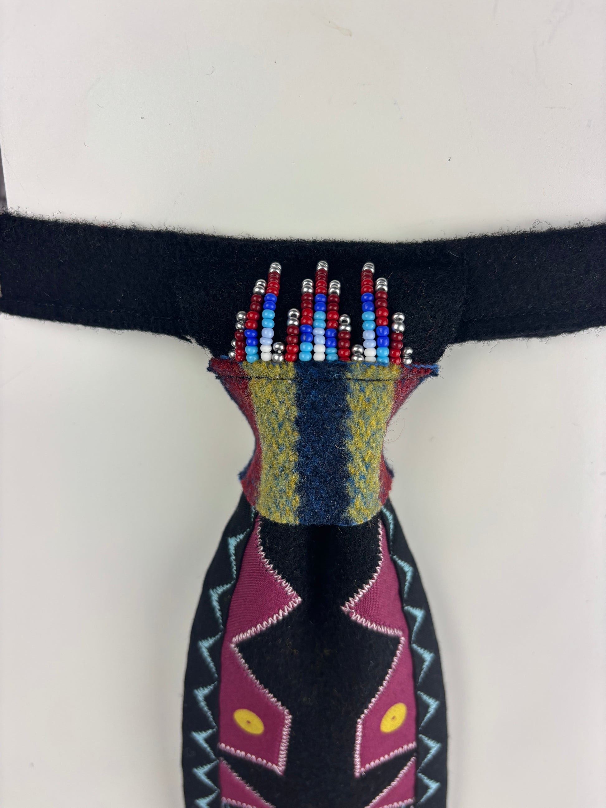 Discover the understated elegance of Simply . Made with luxurious black wool broadcloth, this handcrafted piece features minimal, yet tasteful threadwork and delicate beadwork for a touch of color across the top of the tie. With an adjustable neckline and measuring at 22” long, this tie lets the fabric do the talking.