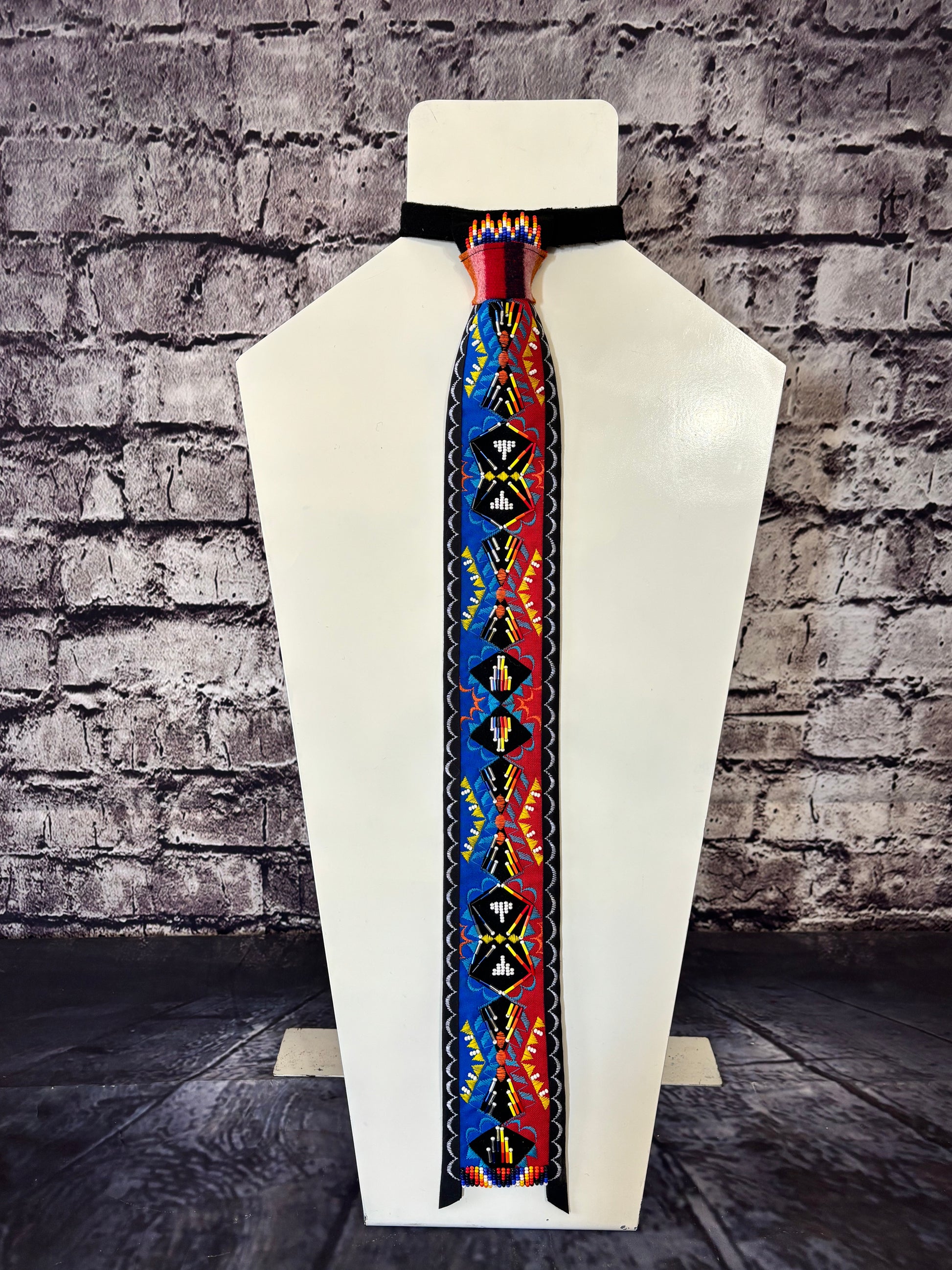 A split Red and Blue appliqué necktie made with black wool broadcloth. Cotton designs in red and blue are appliquéd with coordinating thread colors. Custom beadwork using bugle beads and seed beads. Edged in black bias. Measures around 22” long and has an adjustable neckline.